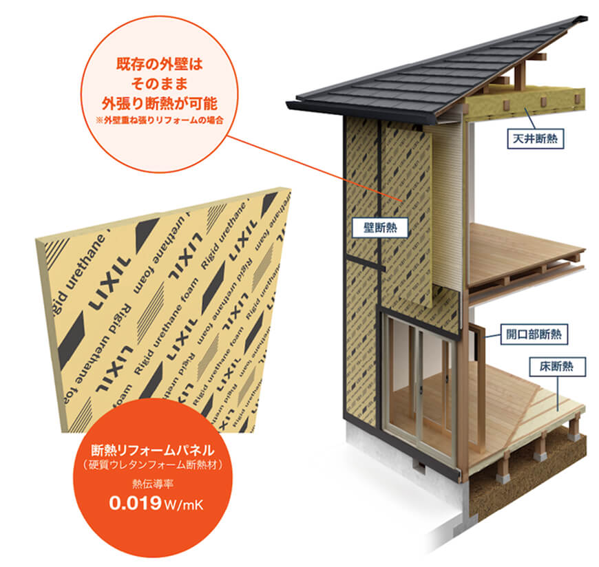 壁の外側に高性能の断熱材を取り付け、さらに天井・床・開口部を断熱することで高性能な新築住宅と同等レベルの性能を実現します。